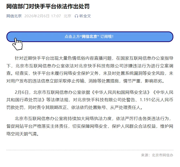 2月6日,北京市互联网信息办公室依据《中华人民共和国网络安全法》《中华人民共和国行政处罚法》等法律法规,对北京快手科技有限公司处警告、1.191亿元人民币罚款处罚,同时责令其限期改正、依法依约处置账号、从严处理责任人。